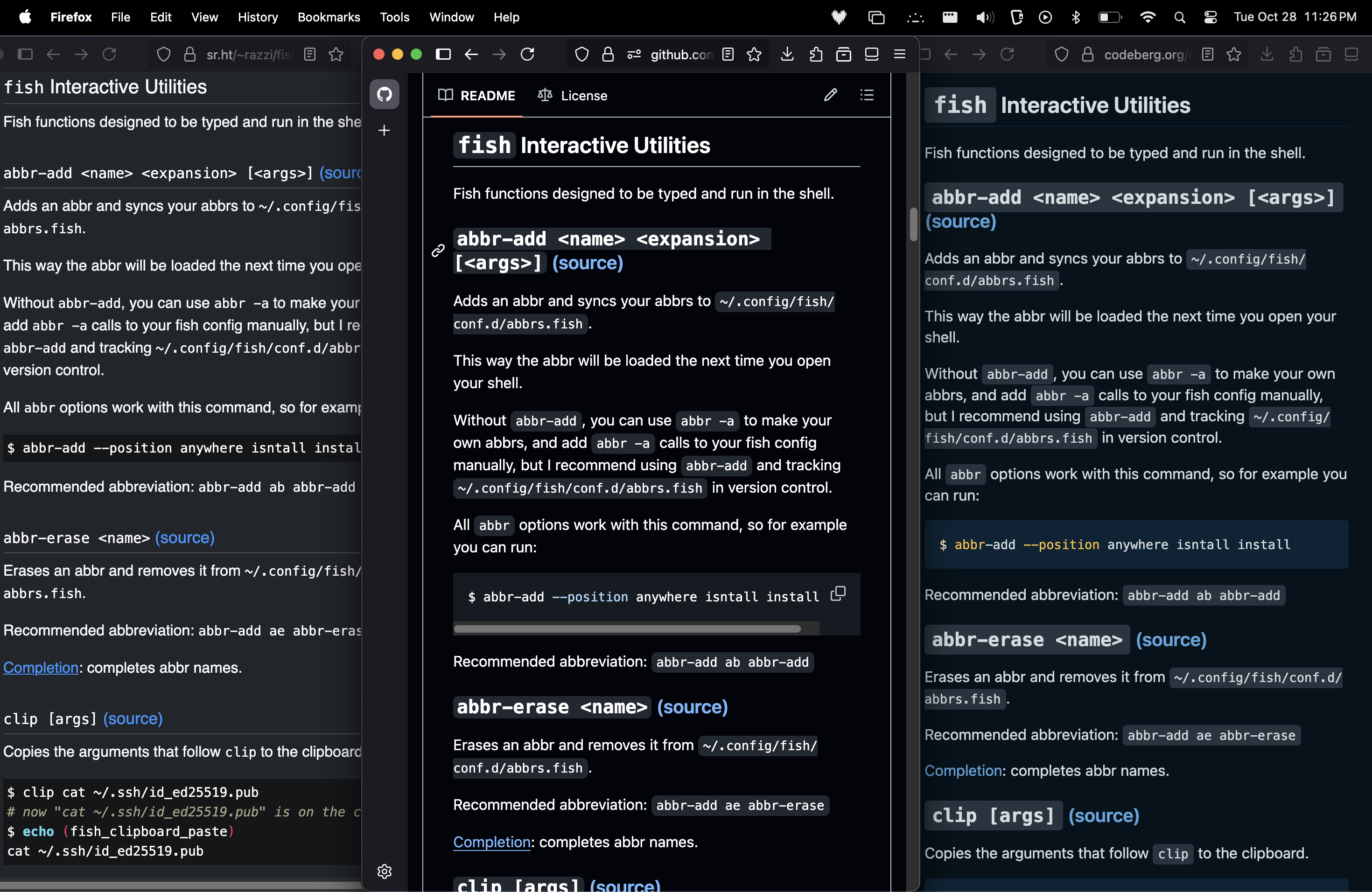Recently I added my fish functions to Codeberg as well, which has some appeal to me since it’s open source but has a bit more visual appeal than sourcehut.