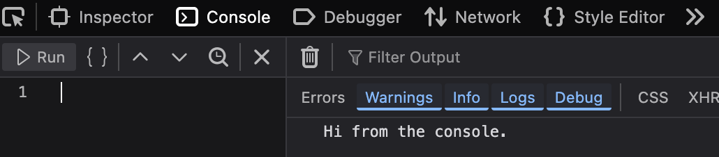 In fact on this very page I have logged this message to the console. You can view the message by opening your developer tools. Every browser does this a bit differently but in firefox it’s enabled by default and available in the tools menu. Once you open the developer tools, switch over to the tab named “Console”.